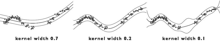 Here is a figure taken from the official website showing how different kernel width affect the regression result of a Gaussian Process. See the video demo of MLDemo at YouTube for more details.